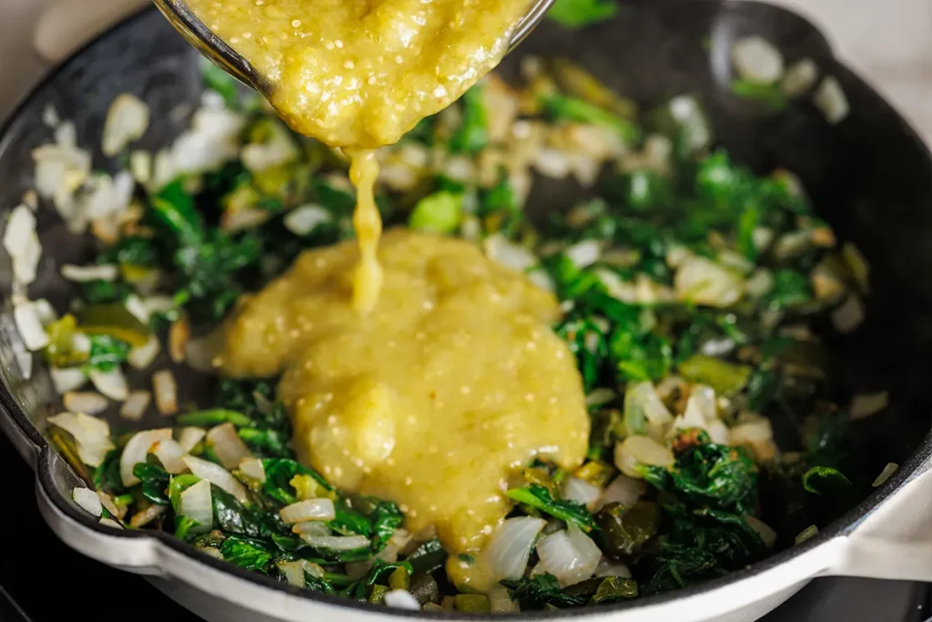 - Stir in the diced poblanos, coriander and cumin, then pour in the tomatillo puree and simmer over low heat for 5 minutes. Taste and adjust seasoning.