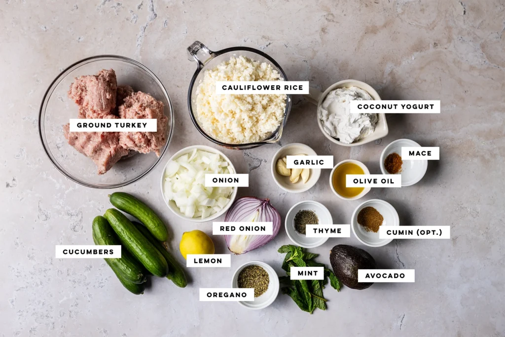 Now it’s time to build the bowl. Start with cauliflower rice. Add the spiced turkey. Spoon the cucumber salad over the top. Scatter some olives and finish with a generous dollop of tzatziki. Garnish with some mint and a few lemon slices for squeezing. It’s hearty, bright, and deeply satisfying — and you’ll never miss the pita.