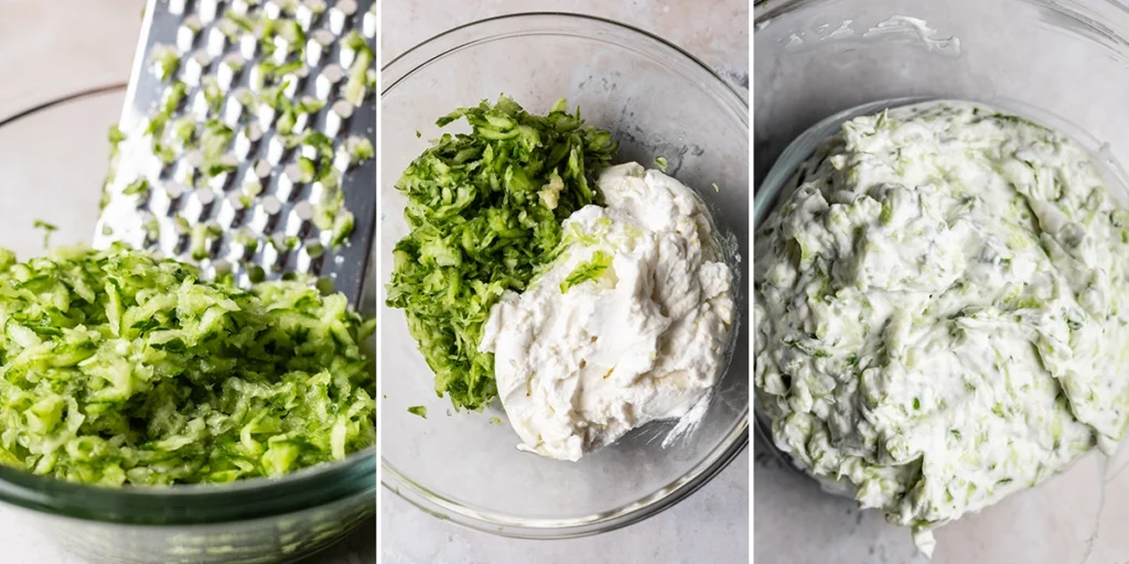 - Grate two Persian cucumbers, then squeeze out as much moisture as possible. Add to a medium bowl.