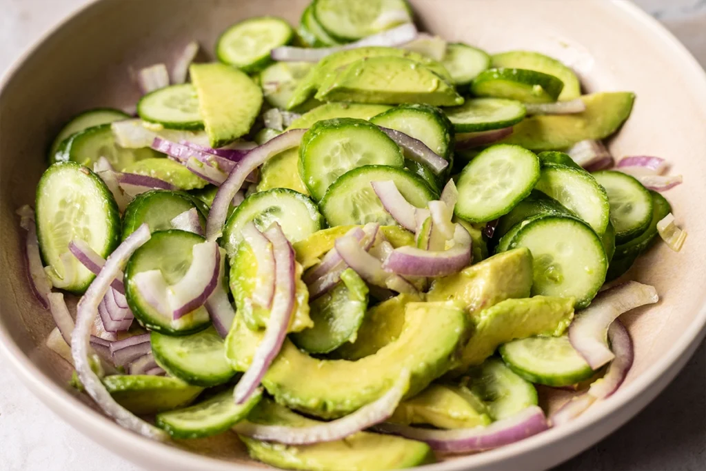 - Thinly slice the remaining cucumbers and toss them in a bowl with the red onion, sliced avocado, the juice of one lemon, a tablespoon of olive oil and a half teaspoon of salt.