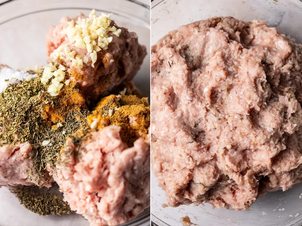- Add the ground turkey and use your hands to work the spice mix into the ground meat until evenly distributed.