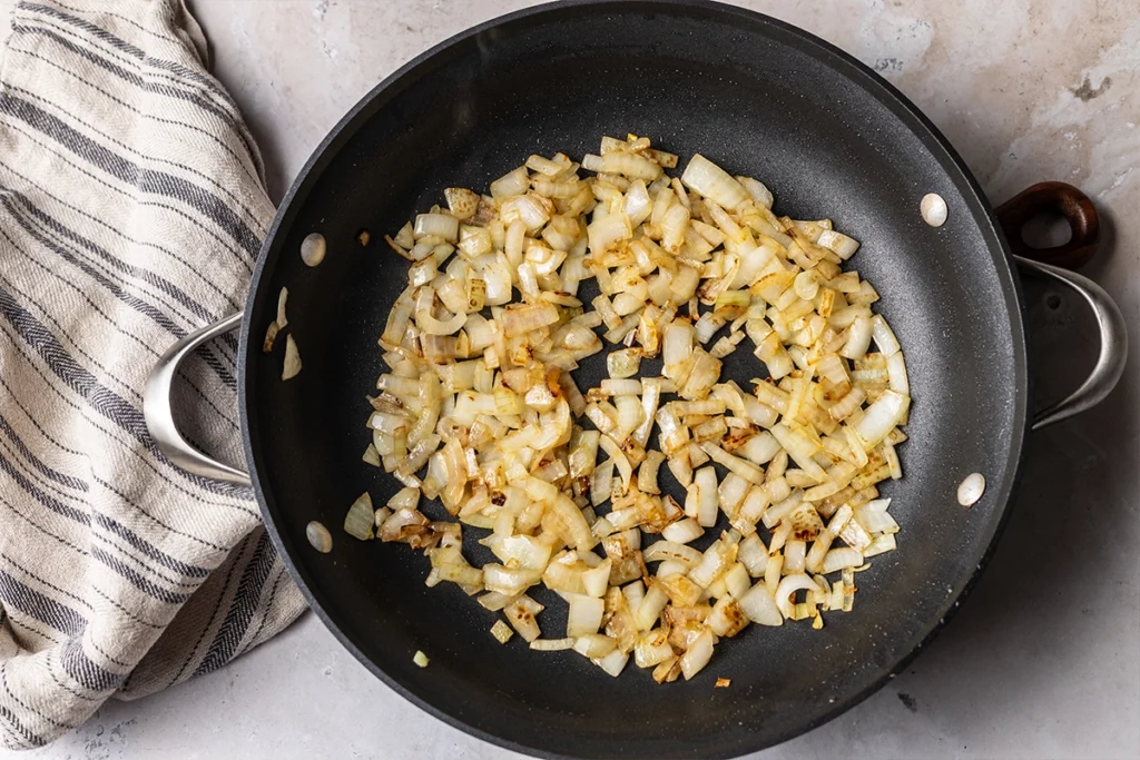 - Heat a tablespoon of olive oil in a large skillet over medium-high heat. Sauté chopped yellow onion with a pinch of salt until just softened, about 2 minutes.