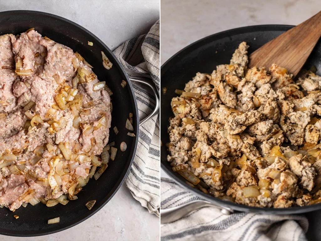 - Add the seasoned turkey and press it into an even layer in the pan. Let it cook undisturbed for 2 to 3 minutes, allowing it to brown, then break it up with a spatula and continue cooking until no longer pink, another 6 to 8 minutes.